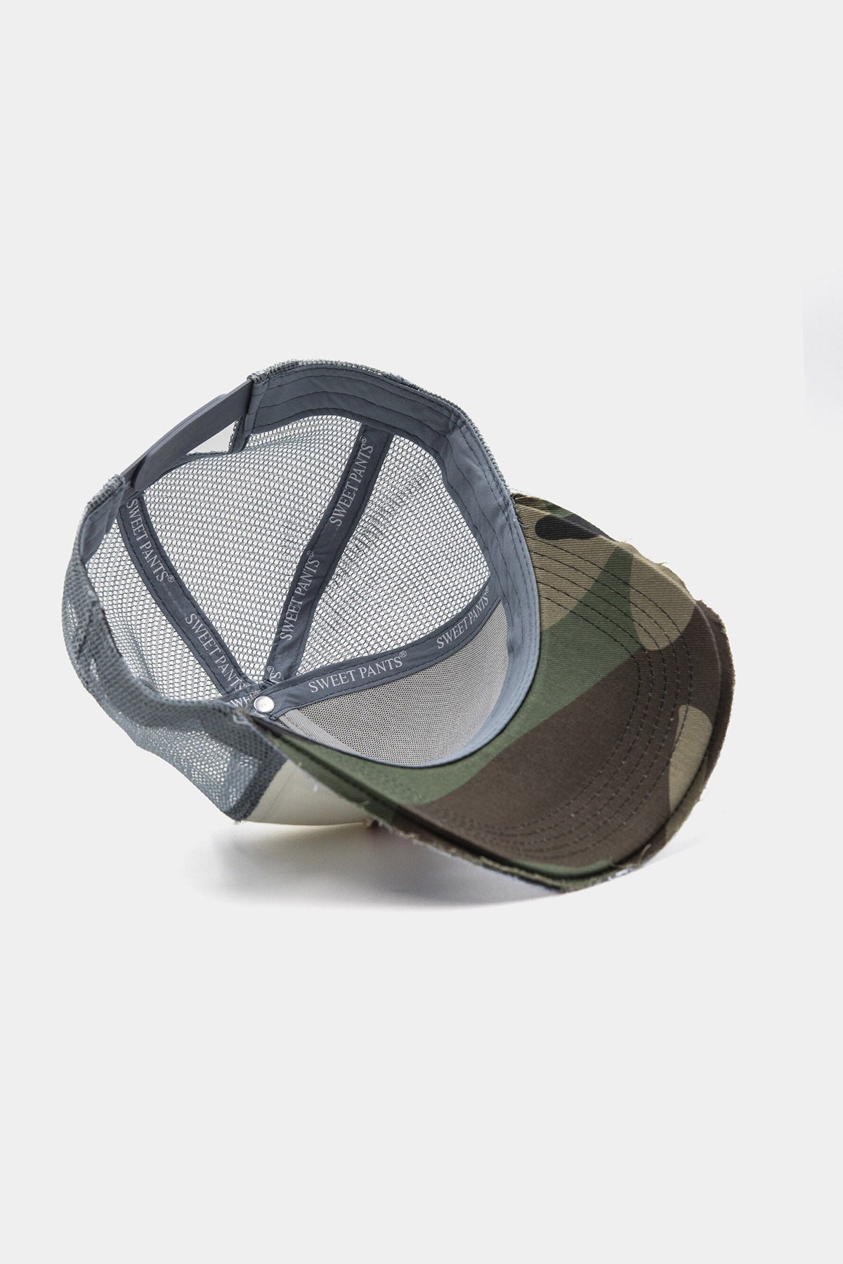 • Patch logo Sweet Pants sur le devant avec tranche visière effet « destroy » et tissu envers visière imprimé camouflage.